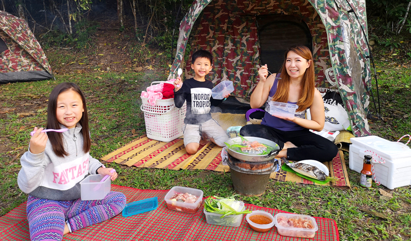 กางเต็นท์เสร็จก็มานั่งทานข้าวเหนียวไก่ย่างกันที่เสื่อหน้าเต็นท์ก่อนดีกว่า
