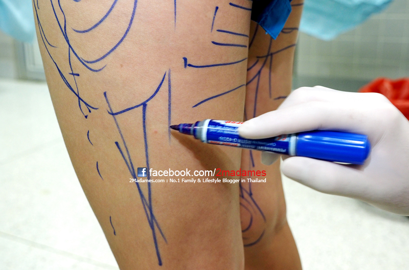 3.) คราวนี้ได้เวลาเริ่มลงมือจริงๆแล้วคะ แอนเลือกใช้ยาชา เลยทำให้แอนมีสติสัมปชัญญะอยู่ตลอดเวลา คุณหมอชวนคุยตลอด ว่าถ้าเจ็บให้บอกนะครับ คุณหมอถามตลอดจริงๆคะ น่ารักมาก เริ่มต้นคุณหมอจะฉีดยาชาที่ตำแหน่งที่จะกรีดเพื่อเปิดตำแหน่งที่จะดูดไขมันก่อนคะ ขั้นตอนนี้จะเจ็บนิดๆเหมือนเวลาเราฉีดวัคซีนคะ แอนว่าสบายมากคะ ไม่หนักหนาอะไรพอเริ่มชาคุณหมอก็กรีดแผลเล็กประมาณ 0.5 ซ.ม. ที่โคนขาหลังบริเวณใต้ก้น 2 จุด ซ้ายขวา ในตำแหน่งระนาบเดียวกัน