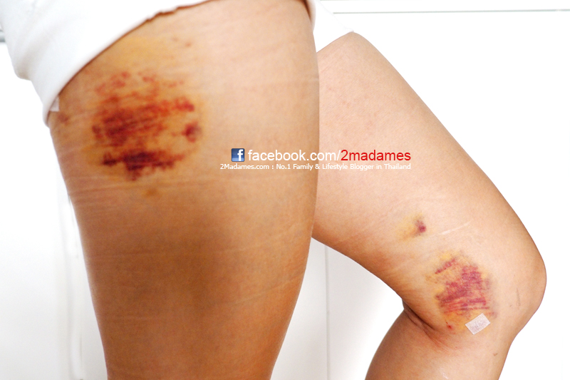 ภาพนี้เป็นภาพวันรุ่งขึ้นหลังจากดูดไขมันเสร็จคะ รู้สึกได้ทันทีว่าเล็กลง ไขมันช่วงใต้ก้น ใต้ขาหนีบ และช่วงขานอกใต้สะโพก ยุบไปทันที เจาะทั้งหมด 6 จุด ตามตำแหน่งผ้าก็อตเลยค่ะ โดยรวมก็ยังมีอาการบวมน้ำเกลือร่วมอยู่ด้วย รอยฟกช้ำยังไม่แสดงให้เห็นเท่าไหร่นักคะ