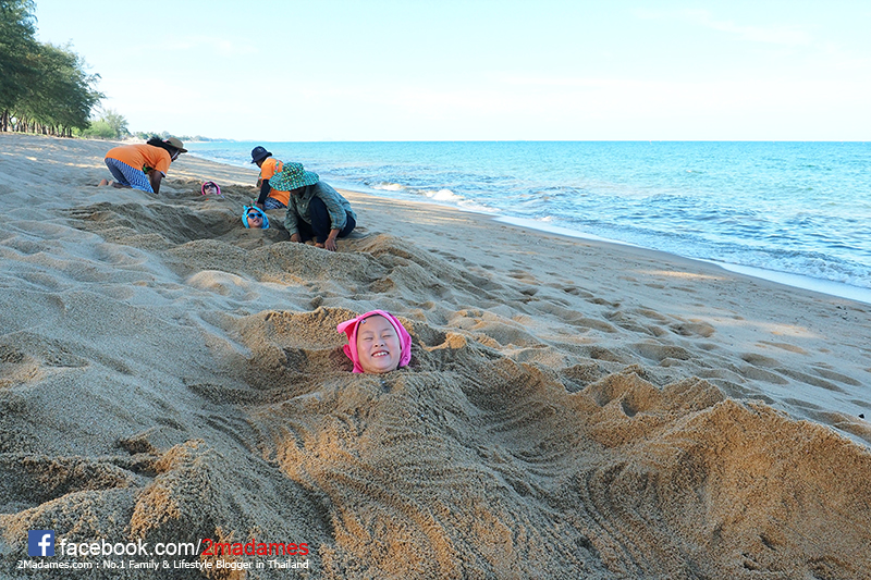 กลบทรายเสร็จแล้ว ป้าจะมาปัดทรายออกจากตัวให้ แปลกที่ทรายบริเวณนี้ปัดออกง่ายมาก ไม่เลอะติดตัวให้สกปรกเลย