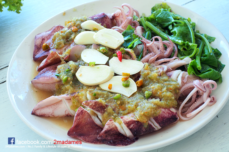 ปลาหมึกไข่นึ่งมะนาว ที่นี่จะใช้ปลาหมึกไซส์เล็กแต่ไข่แน่นๆ นึ่งมาสุกกำลังดีเลยได้ปลาหมึกที่เด้งๆ ทานคู่กับผักลวก