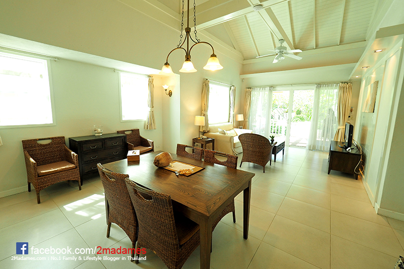 ห้องนั่งเล่นกว้างขวางสะอาดดี มีทั้งโซฟาและโต๊ะรับประทานอาหาร