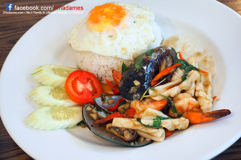 ข้าวราดกะเพราะทะเล มีทั้งกุ้ง ปลาหมึก หอยตัวโตๆ แถมมีไข่ดาวโปะมาให้ด้วย จานใหญ่มากทานไม่หมดเลย