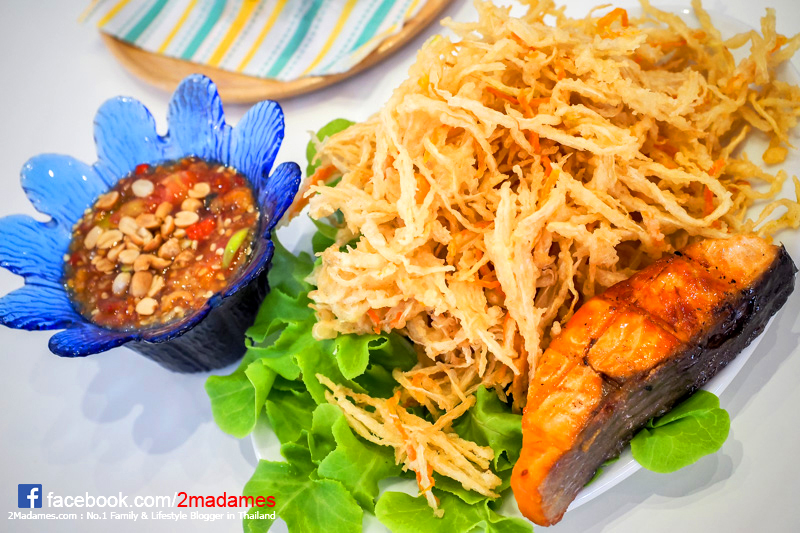 ลองเมนูแบบไทยๆบ้างกับเมนู “สลัดส้มตำทอดแซลมอน” ราคา 175 บาท คือดีงามน้ำส้มตำแซ่บ เนื้อปลาอร่อย