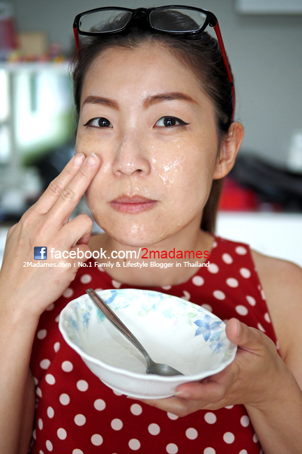 เริ่มขั้นตอนเลยดีกว่าจ้า จริงๆใช้นิดเดียวเองคะประมาณครึ่งแผ่น ตัดแบ่งแล้วละลายในน้ำอุ่น ใส่น้ำนิดเดียวพอนะคะ เดี๋ยวจะเหลวเกินไป ละลายให้รู้สึกว่าข้นๆหน่อย เตรียมส่วนผสมเรียบร้อยแล้วก็โบกลงบนหน้าให้ทั่ว เว้นช่วงไรผม หนวด และคิ้วนะคะ
