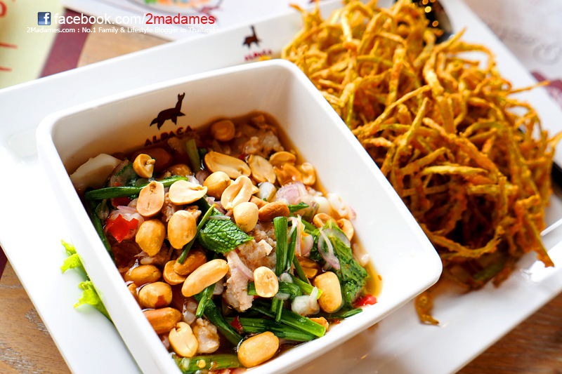ส่วนอาหารจานแรกกันที่ยำผักบุ้งทอดกรอบ ผมสั่งทางร้านแยกน้ำยำมา เพราะเด็กๆจะได้ทานผักทอดกันได้ จานนี้ราคา 150 บาท ตอนแรกที่สั่งดูจากการตกแต่งของร้านเข้าใจว่าคงมาจานเล็กๆ แต่พอเสิร์ฟจริงจานโตมาก แถมเครื่องยำก็มีทั้งกุ้งตัวโต และปลาหมึกสดๆชิ้นโต หมูสับมาอีกเพียบ ถั่วลิสงคั่วกรอบๆเม็ดใหญ่ทีเดียว สส่วนน้ำยำก็ครบรสแซ่บถึงใจใช้ได้เลย ที่ชอบอีกอย่างคือทางร้านใช้แต่ก้านผักบุ้งไทยซอยเป็นเส้นฝอยๆแล้วค่อยทอด เด็กๆทานง่ายกรอบไม่เหนียวเลย
