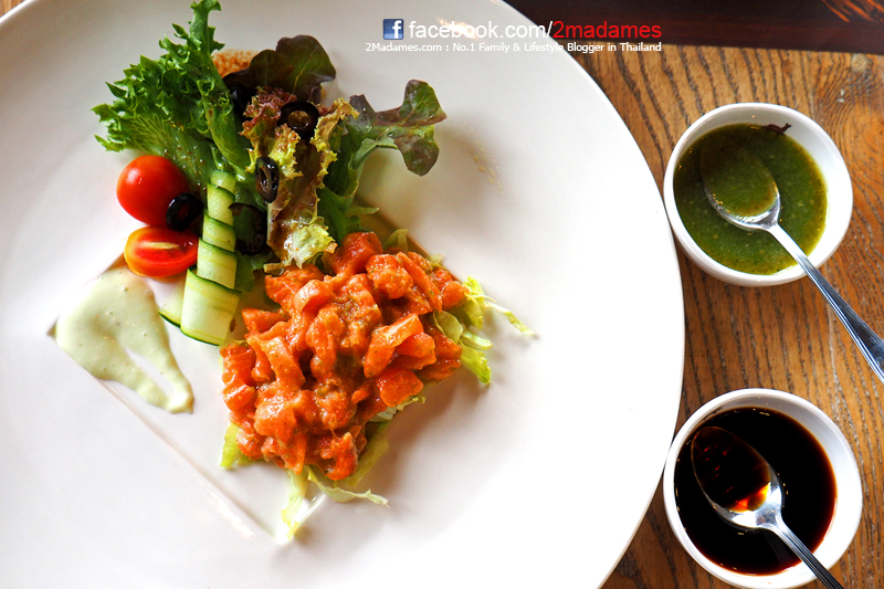 ส่วนจานนี้ชื่อว่าแซลมอนจี๊ดจ๊าด ราคา 120 บาทเอง อย่างถูก ทางร้านเอาเนื้อแซลมอนมาหั่นเต๋าหยาบๆคลุกเคล้าซอสน้ำยำสูตรเฉพาะที่รสชาติกลมกล่อม ออกเผ็ดเพียงนิดเดียวคนไหนทานเผ็ดน้อยๆตักทานแบบนี้ก็อร่อยเลยส่วนใครทานรสจัดเวลาทานราดน้ำจิ้มซีฟู้ดส์เพิ่มอีกสักหน่อย อร่อยอย่าบอกใครเชียว แถมเสิร์ฟมากับผักสดๆจะทานเป็นเมี่ยงหรือคลุกเคล้ากับน้ำสลัดวาซาบิที่ราดมาข้างๆก็อร่อยได้ไม่เบา
