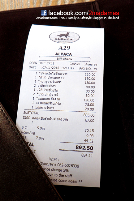 ทั้งหมดมื้อนี้พวกเราจ่ายไปแค่ 892.50 บาท ได้รับส่วนลด 10% จากโปรโมชั่นฉลองเปิดร้านใหม่โดยการไลค์เพจ Alpaca Restaurant และแชร์เพจจ้า ร้านนี้มี Service Charge 5% และ Vat 7% ต่างหากนะครับ แต่ทั้งหมดที่จ่ายไปราคานี้ถือว่าถูกเลยล่ะ