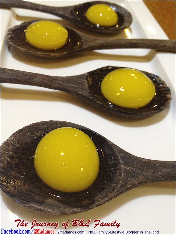 ปิดท้ายด้วยของหวานที่หนูน้อยเบลล่าปลื้มสุดๆ จะเป็นการนำน้ำส้มไปรังสรรค์มาเป็นเหมือนไข่แดง มากัดผ่านผิวด้านนอกที่มีลักษณะเหมือนเจลาตินเข้าไป น้ำส้มก็จะพุ่งทะลักออกมา