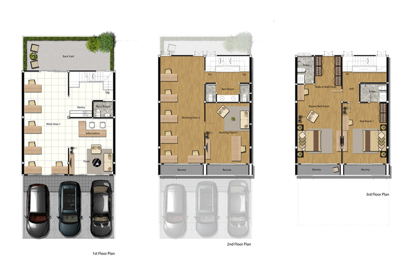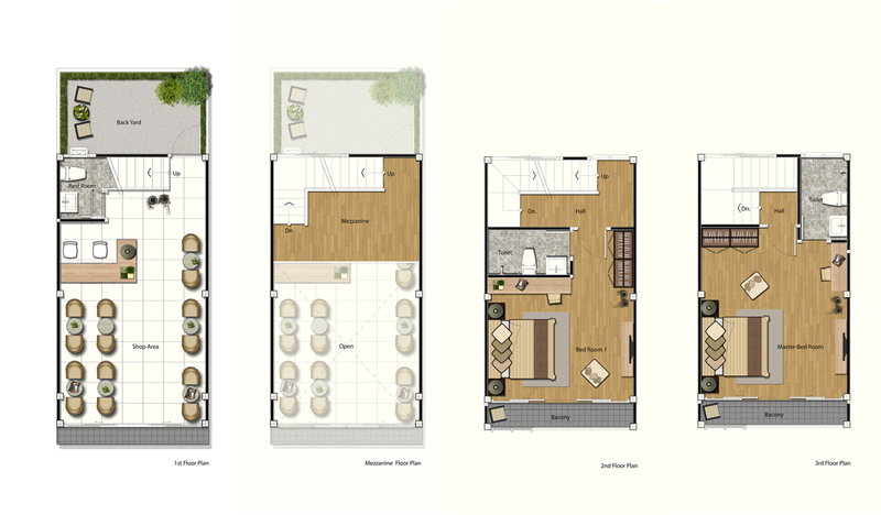 ส่วนแบบบ้านของบริเวณตึกริมที่ติดถนนในซอยรามคำแหง 21 หน้ากว้างจะน้อยลงมา แต่มีเพดานสูงและชั้นลอยมาแทน