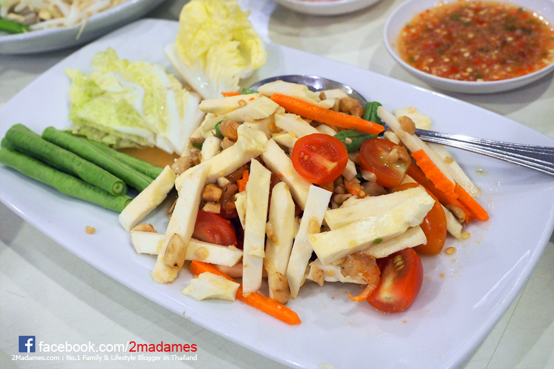 ส้มตำทุเรียน ราคา 150 บาท ส่วนตัวผมว่าเป็นเมนูที่สร้างสรรค์ดี เพราะคนไทยกับส้มตำยังงัยก็ได้ทานบ่อยๆ ทางร้านใช้ทุเรียนห่ามๆ สียังเป็นเหลืองอ่อนมากๆออกสีครีมๆ เนื้อจะกรอบๆ ให้อารมณ์เหมือนทานมะละกอดิบกรอบๆ ส่วนรสชาติอ่อนไปนิด จริงๆถ้าจัดจ้านกว่านี้จะดีมาก แต่ก็ต้องชมว่าสัตถุดิบทุกอย่างคัดของดีมาปรุง ทั้งกุ้งแห้งและถั่วลิสงคุณภาพดีมาก