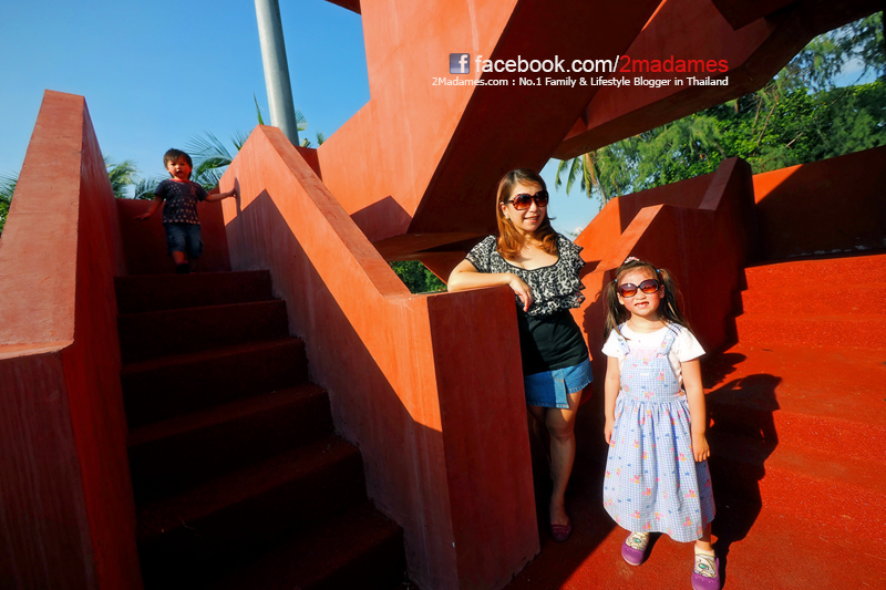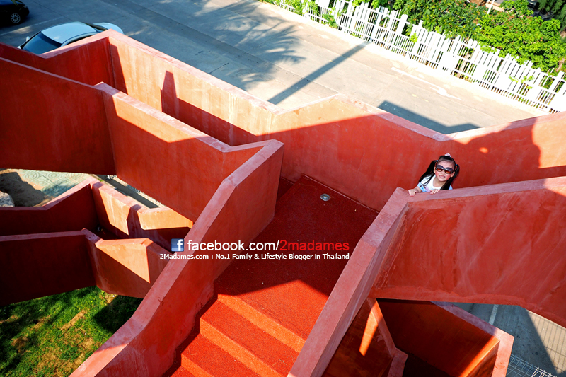 คือแนวคิดในการออกแบบให้เด็กและผู้ใหญ่ได้ออกกำลังกายร่วมกัน พร้อมซึมซับบรรยากาศธรรมชาติในคราวเดียว โครงสร้างคอนกรีตจึงเน้นการใช้ ปูนโครงสร้างที่แข็งแกร่งของตราช้าง นำมาผสมสีแดงลงในเนื้อปูน และหล่อในที่ มั่นใจในความแข็งแรง ปลอดภัย ทางเดินและบันไดสร้างขึ้นมาเป็นโมดูลาร์ (Modular) เชื่อมต่อกัน ถ้าเดินครบ 1 รอบ จะเผาผลาญได้ 10 แคลอรี่ อาคารนี้จึงมีชื่อเล่นว่า “10 แคลอรี่ทาวเวอร์”