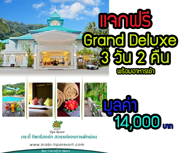 แจกฟรี Voucher ที่พักจาก Krabi Tipa Resort ห้อง Grand Deluxe 3 วัน 2 คืน พร้อมอาหารเช้า + Welcome Drink & Fruit + Wireless Internet พร้อมส่วนลดสปา 20% มูลค่า 14,000 บาท