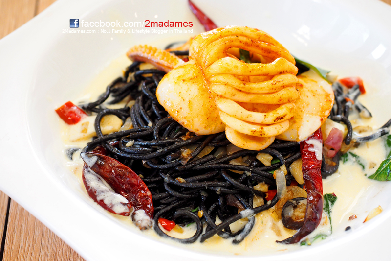 สปาเก็ตตี้เส้นดำปลาหมึกซอสพริกขี้หนู ราคา 149 บาท น่าจะเป็นเมนูที่ประทับใจมากที่สุดของมื้อนี้เลย ทั้งรสชาติและราคา เส้นสปาเก็ตตี้ลวกมาได้สุกกำลังดี คลุกเคล้ามาในซอสครีมผัดพริกแห้ง พริกขี้หนูและกระเทียม รสชาติอร่อยลงตัวทีเดียว แถมปลาหมึกก็สดมาก แล่มาได้สวยงามน่าทานดีครับ