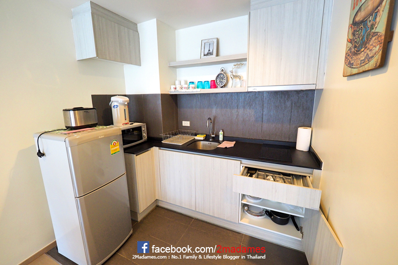 มีครัวพร้อมอุปกรณ์ต่างๆด้วยนะ เตาไฟฟ้า ตู้เย็น เครื่องปิ้งขนมปัง ไมโครเวฟ หม้อ กระทะ จานชาม ช้อนส้อม มีหมดเลย