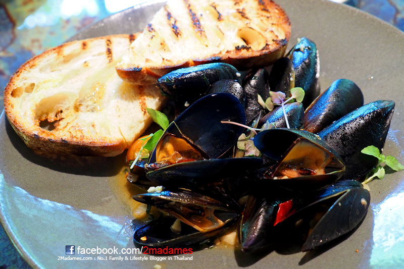 Spicy Black Mussels ราคา 440++ เมนูนี้เป็นอีกเมนูที่คุณนายผมเธอชื่นชอบเอามากๆเลย ด้วยความที่เธอชอบทานหอยทุกชนิดเป็นทุนเดิม มาเจอหอยแมลงภู่จากนิวซีแลนด์ผัดซอสไวน์ขาว หัวหอม มะเขือเทศ และใบกระเพรา ทานกับขนมปังปิ้งจิ้มน้ำที่ผัดมาขลุกขลิก เชื่อมั้ยทานคนเดียวหมดจานเลย ผมชิมแค่ตัวเดียวเท่านั้น