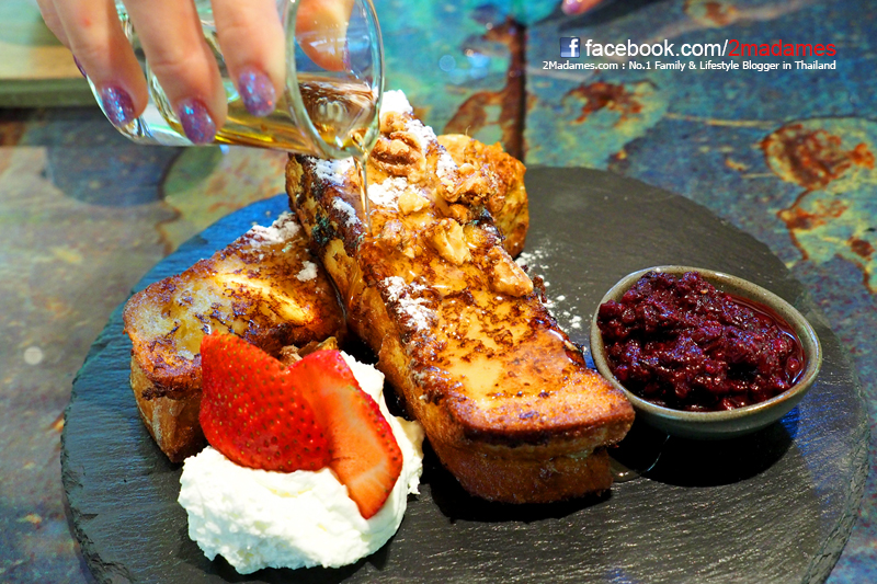 Brioche French Toast ราคา 240++ เป็นขนมปังนุ่มๆชิ้นหนาชุบไข่แล้วเอามาทอดกับเนย โรยหน้าด้วยถั่วแอลมอนด์และวอลนัท ราดไซรัป ทานกับวิปครีมและสตรอเบอรรี่สดรสเปรี้ยวๆหน่อยอร่อยดีจ้า ส่วนถ้วยเล็กๆที่เสิร์ฟมาคู่กันนั้นเป็นซอสบลูเบอร์รี่สดรสชาติเปรี้ยวจี๊ด ทานคู่กับขนมปังแล้วตัดเลี่ยนไปได้เยอะเลย สรุปคุณนายผมชอบมากครับ