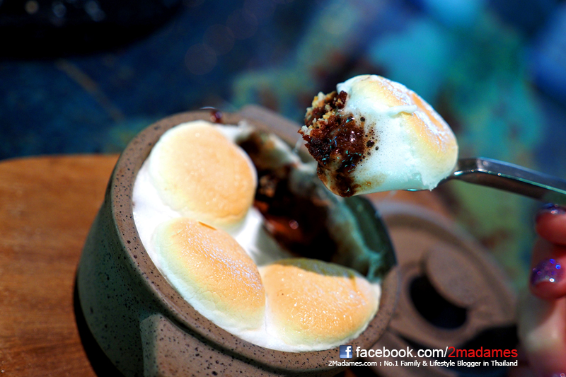 Smores in a Pot ราคา 180++ หน้าตาที่เสิร์ฟมาเหมือนรูปในเมนูเป๊ะ คือเป็นมาชเมโลวอบมาฟูๆ ด้านล่างจะเป็นดาร์คช๊อกโกแลตจากเบลเยี่ยม และช๊อคเบรด คล้ายๆคุกกี้บดที่ชุ่มๆด้วยช็อคโกแลต อร่อยมากมายจริงๆครับ