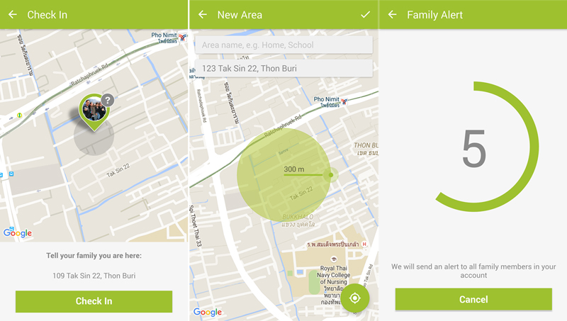 หรือเราสามารถกำหนดบริเวณปลอดภัยได้ เช่น ระบุพิกัดบ้านหรือโรงเรียนไว้ หากมีการออกจากพื้นที่ที่กำหนด แอพก็จะแจ้งเตือนมายังสมาชิกทุกคนให้รู้ แถมยังตั้งได้มากถึง 30 บริเวณ ทั่วโลก
