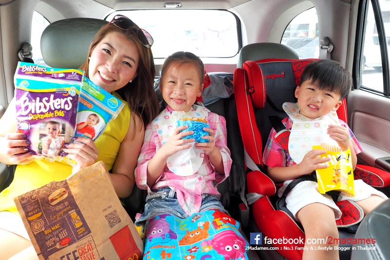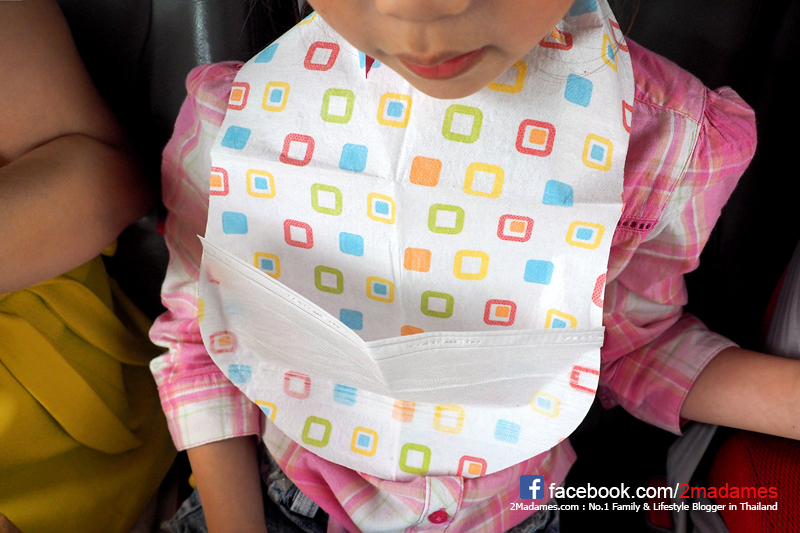 แต่เด็กๆทานเบอร์เกอร์กันบนรถ เราก็กลัวว่าจะทานกันหกเลอะเทอะรถ ยังดีที่ช่วงนี้มีเจ้า Bibsters ของแบรนด์ Neat Solutions พกติดตัวมาด้วยตลอด ที่จริงมันเป็นกระดาษกันเปื้อนสำเร็จรูปนั่นเอง คือมันดีมากเลย ที่คอเป็นแถบกาวแปะกันใช้สะดวกมาก ชายกันเปื้อนมีช่องกันเศษอาหารตกลงไปด้วยนะ เรียกว่าใส่แล้วไม่ต้องห่วงเลอะเสื้อผ้าเลย