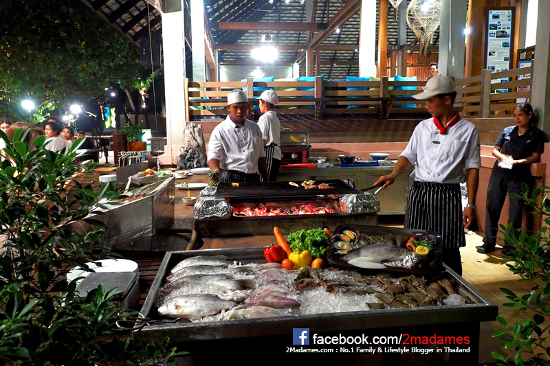 มื้อเย็นเรามาทานกันที่ห้องอาหารในอ่าวพร้าวรีสอร์ทนี่แหละ ทุกคืนวันศุกร์และเสาร์เค้ามี BBQ Tonight ให้บริการตั้งแต่เวลา 18.00-21.00 น. มีราคาบอกไว้เสร็จสรรพ เลือกเอาได้เลยอยากได้ปลา กุ้ง ปลาหมึกตัวไหน ขายกันเป็นน้ำหนักจ้า จานไหนราคาเกิน 450 บาท++ ก็ตัดสลัดบาร์ทานฟรีๆด้วยนะ