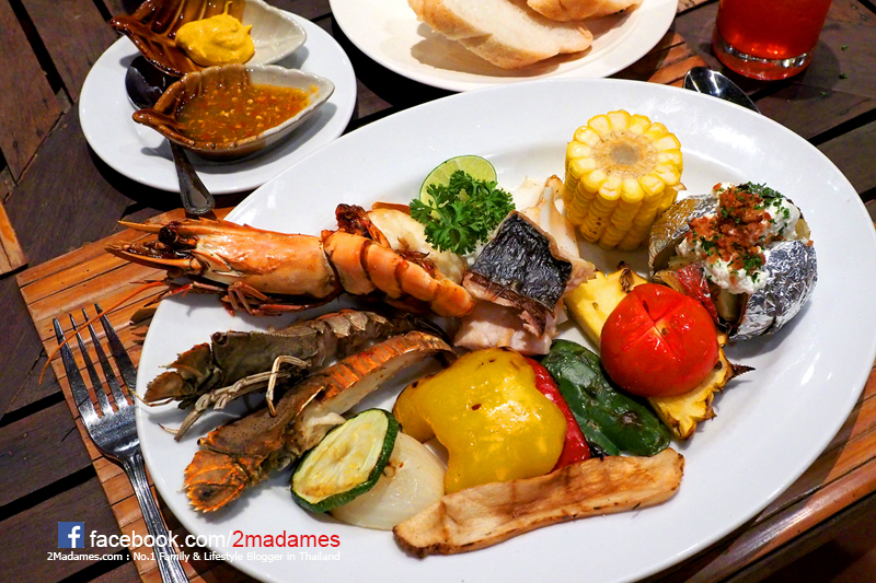 ซีฟู๊ดเค้าสดอร่อยดีนะครับ จานนี้ Mixed Seafood ราคา 695 บาท++ ถ้าเทียบกับราคาอาหารบนเกาะ และอาหารโรงแรม ราคาขนสดนี้ถือว่าไม่แพงนะ มีทั้งกุ้งลายเสือ กั้ง ปลาหมึกและปลากะพง พร้อมผักย่างอีกเพียบเลย เสิร์ฟคู่ข้าวโพดย่างและมันอบ ทานให้จุกกันไปข้างเลย