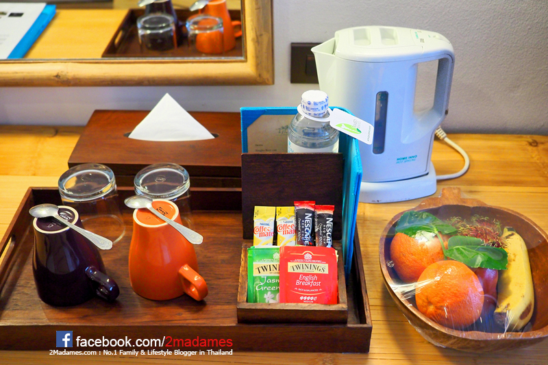 บนโต๊ะมีชากาแฟให้ดื่ม และผลไม้ต้อนรับให้ทานฟรี