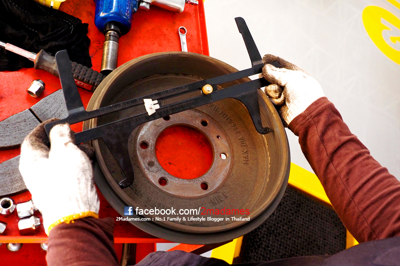 ช่างเค้าตรวจสภาพช่วงล่าง ระดับโช๊ค แล้วถอดผ้าเบรกมาวัดว่ายังสามารถใช้งานได้ดีอยู่หรือเปล่า