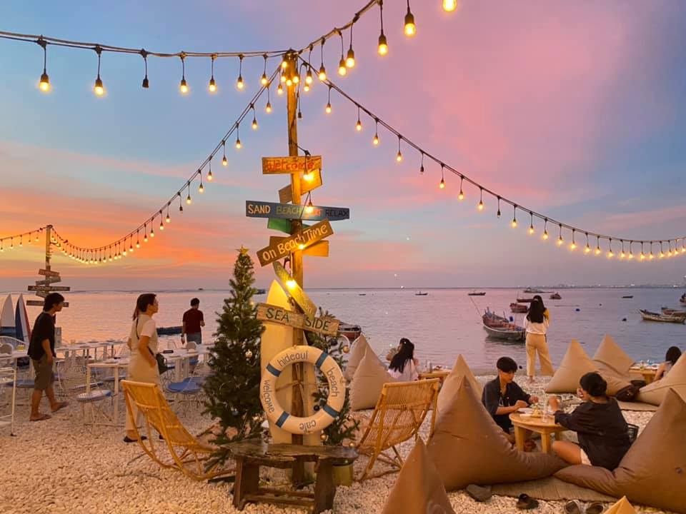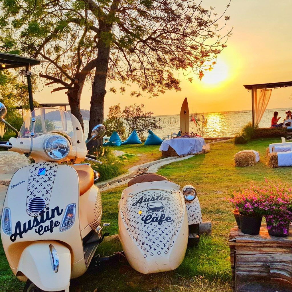 อีกหนึ่งร้านกคาเฟ่สุดฮิตของบางแสน ชลบุรี คาเฟ่นี่เป็นหนึ่งในจุดเช็คอินของใครที่มาบางแสน เพราะร้านนี้บรรยากาศริมทะเลดีมาก เหมือนกับว่าเราไปอยู่กลางทะเล อยู่บนเกาะเล็ก ๆ บรรยากาศค่อนข้างเป็นส่วนตัว การตกแต่งร้านคือดีมาก จุดเด่นที่ต้องมาถ่ายรูปเลยก็คือ บริเวณซุ้มสี่เหลี่ยม มีผ้าม่านสีขาวทั้งสี่เสาที่ตั้งตระหง่านอยู่ริมทะเล คือภาพมุมนี้ตกเย็นพระอาทิตย์ลับขอบฟ้าพร้อมเครื่องดื่มเย็น ๆ สักแก้วเป็นอะไรที่ดีงามรอให้คุณไปถ่ายรูปลงโซเชียลอยู่แล้ว และอาหารเครื่องดื่มก็มีให้เลือกทานมากมาย นั่งได้ตั้งแต่กลางวันไปจนถึงดึก ๆ ได้เลย