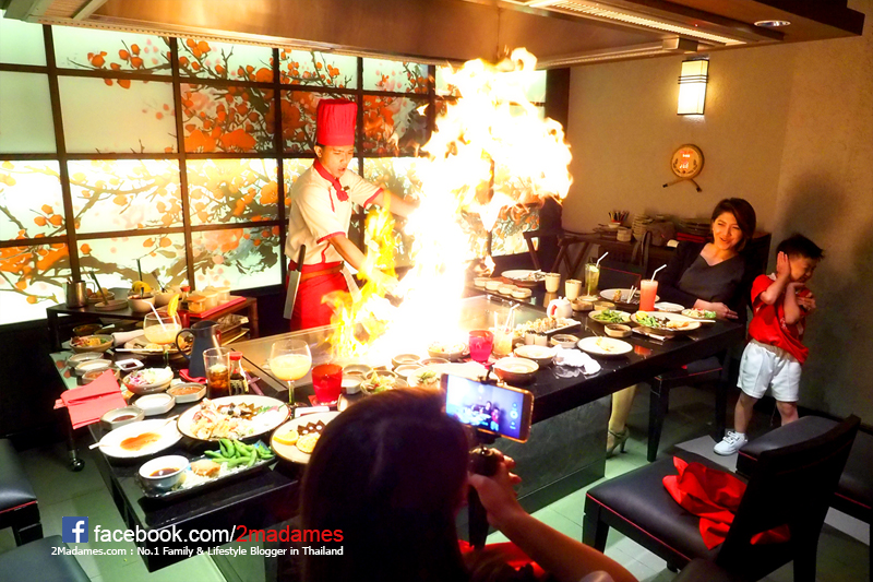 ถึงเวลาโชว์แล้ว ไฟลุกท่วมเลย เด็กๆตื่นเต้นปนตกใจกันใหญ่ เชฟเอนเตอร์เทนลูกค้าได้สนุกมาก พูดหยอกล้อมุกเยอะมาก