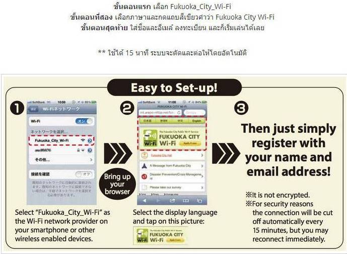 ที่ฟุกุโอกะ มีฟรีไวไฟให้ใช้นะครับ ต่อทุกๆ 15 นาที ถ้าอยากได้ความคล่องตัวจะใช้ Pocket Wifi หรือจะใช้ พรีเพดซิม ก็ได้ครับ