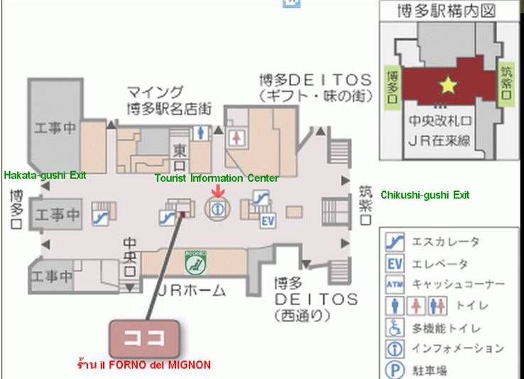 ในส่วนของตัวสถานี Hakata นะครับ ด้านหลังสถานีจะอยู่ทางตะวันออก ชื่อ Chikushi-gushi Exit ส่วนด้านหน้าสถานีจะอยู่ทางตะวันตก ชื่อ Hakata-gushi Exit