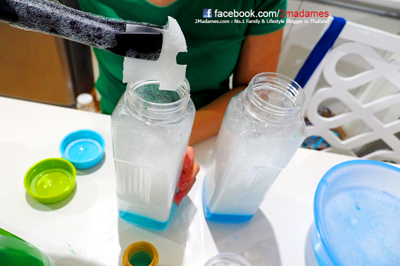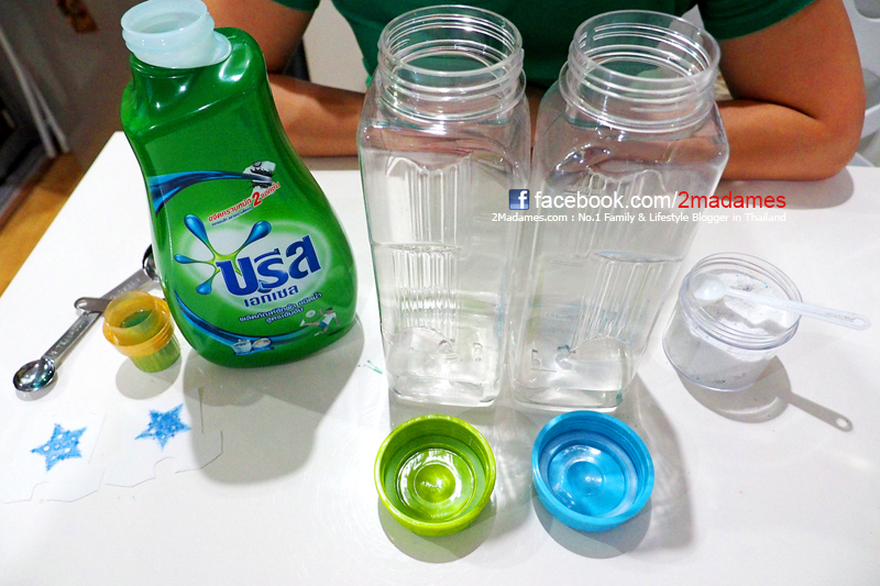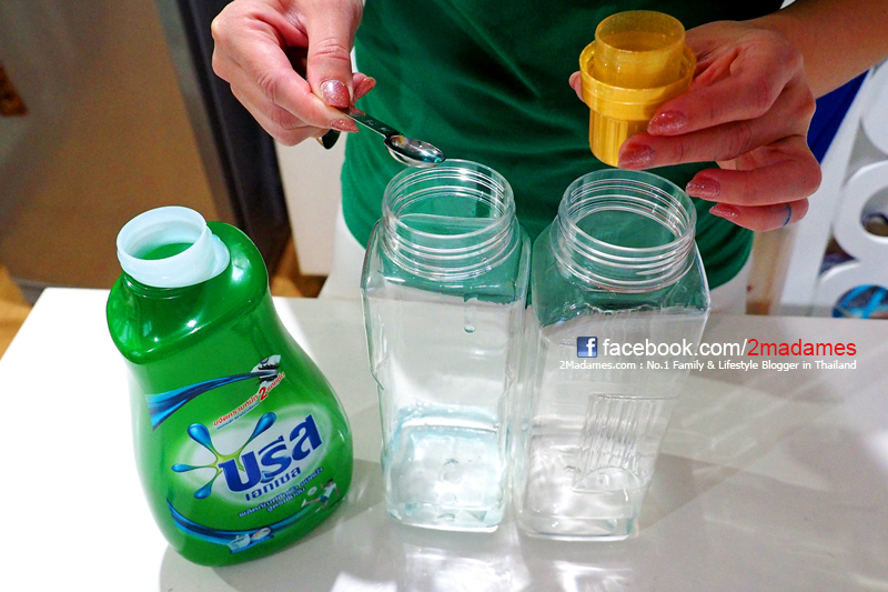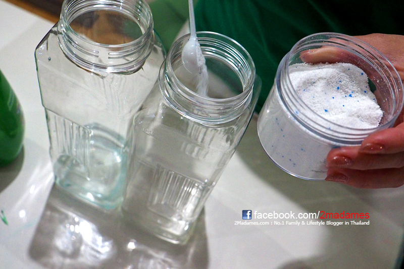 ส่วนฝั่งขวาฝาสีฟ้าใส่ผงซักฟอกธรรมดาลงไป ครึ่งของครึ่งช้อนชา เช่นกัน