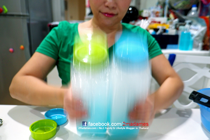 ฝั่งซ้ายฝาสีเขียวใส่บรีสเอกเซล สูตรน้ำลงไป ครึ่งของครึ่งช้อนชา