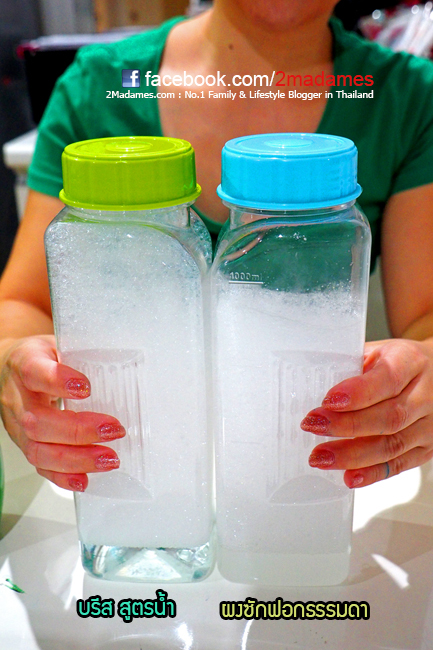 ผลการเขย่าจะเห็นได้ว่าในปริมาณเท่ากัน บรีสเอกเซล สูตรน้ำ ให้ฟองเยอะกว่าแบบผงซักฟอกธรรมดาพอสมควรเลย