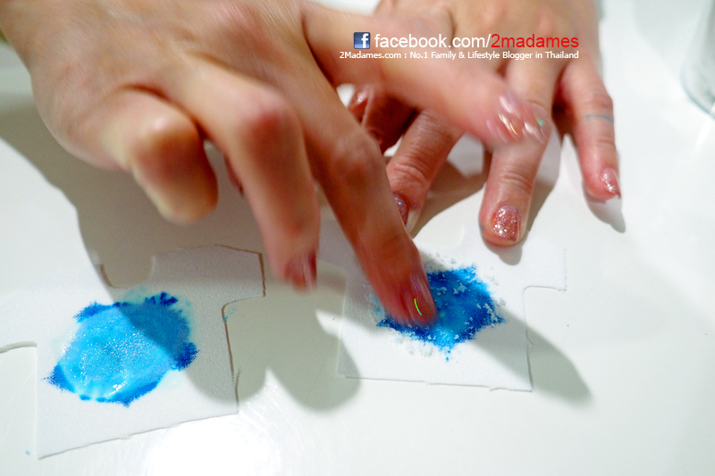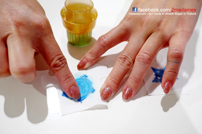 ส่วนแอนก็นำผ้าสองชิ้นมาปั้มหมึก เพื่อเตรียมคราบหมึกที่เราจะมาทดสอบกัน