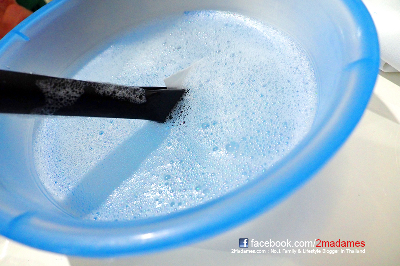 จากนั้นก็นำมาป้ายด้วยผงซักฟอกแบบผงแล้วหยดน้ำ แล้วถูวน 20 รอบเช่นกัน