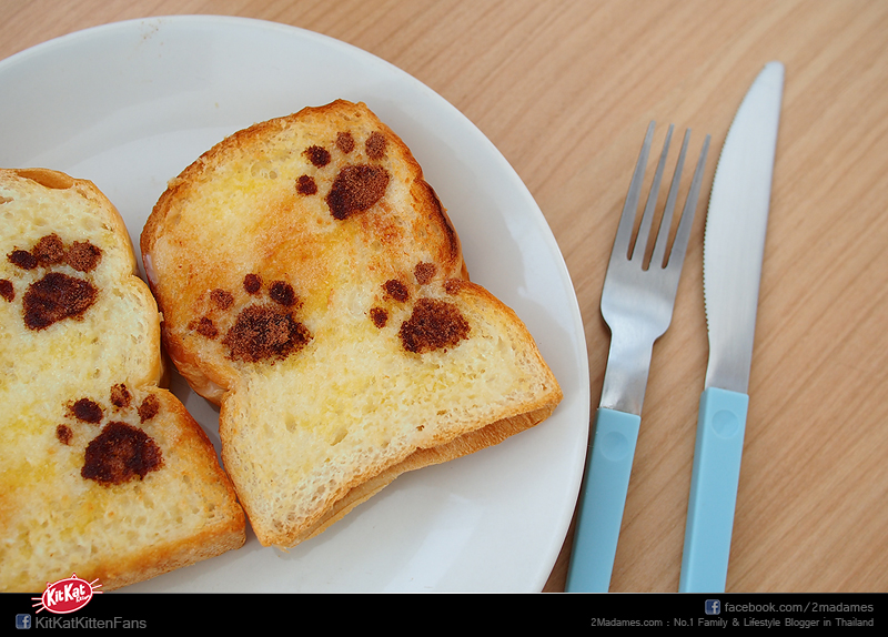 และอีกเมนูน่ารักๆ “Catch me if you can” เป็นขนมปังปิ้งทาเนย มีรอยเท้าแมวที่เกิดจากการโรยผงโอวันตินลงไปค่ะ