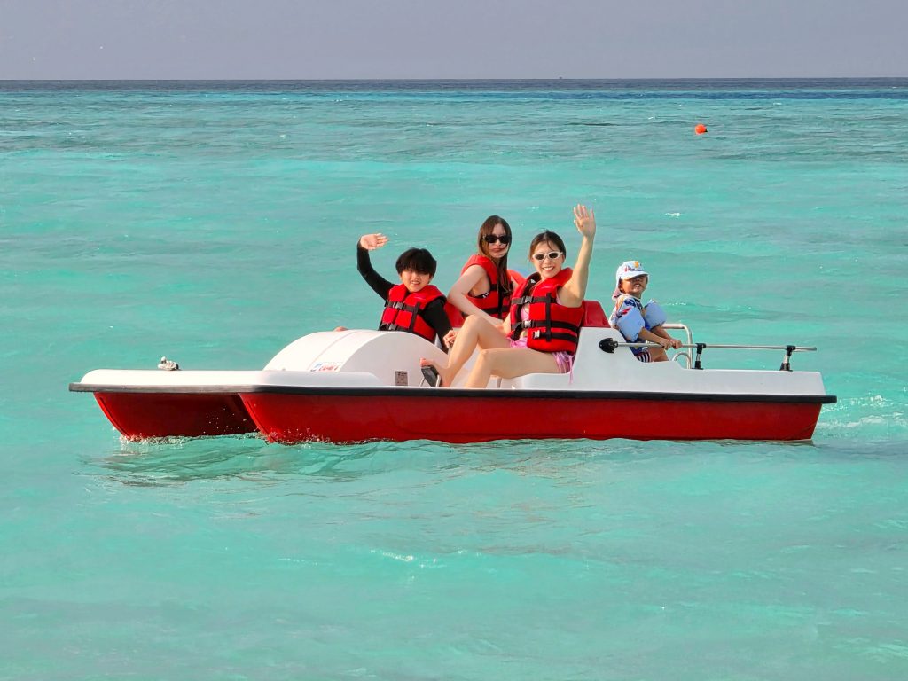 รถปั่นอันนี้ฟรีนะ เค้ายังมีกิจกรรมทางน้ำอย่างพวกเรือปั่น พายคายัค Sup Board ให้เล่นฟรีด้วยนะ