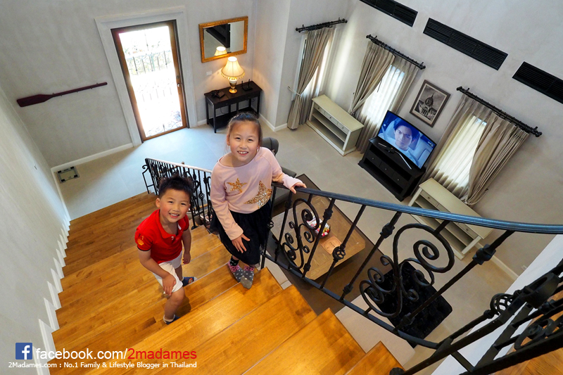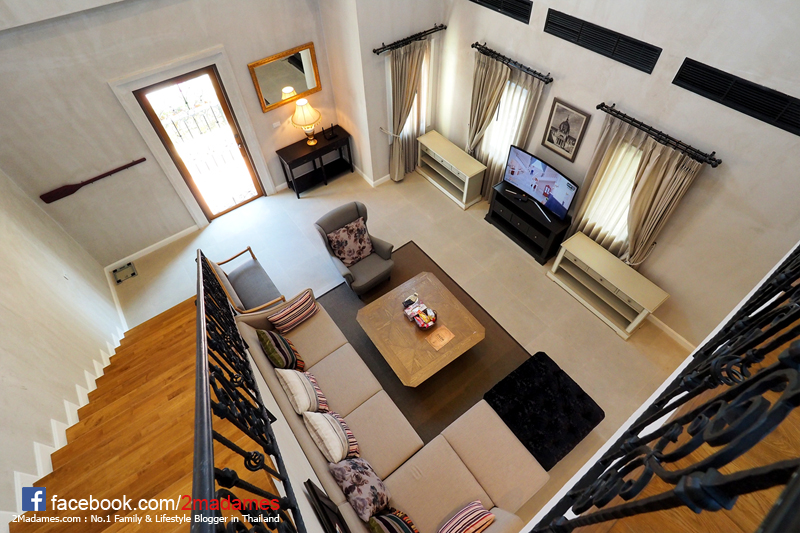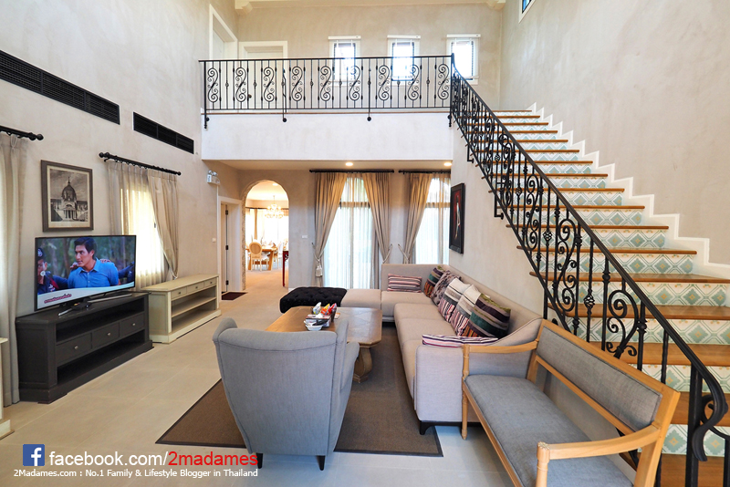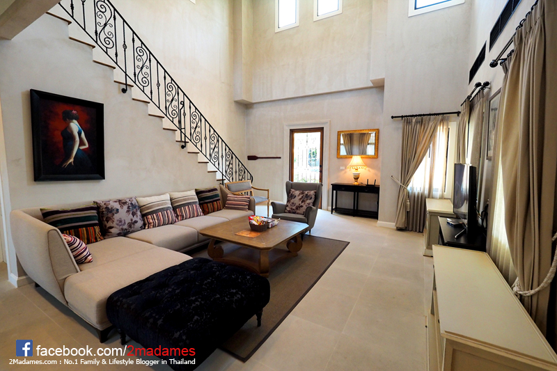 เข้ามาแล้วจะเจอกับห้องนั่งเล่นก่อน ซึ่งจะมีบันไดขึ้นไปชั้นสองด้วย จุดเด่นคือเพดานสูงมาก ทำให้เป็นโถงห้องที่โปร่งมาก จะไม่รู้สึกอึดอัดเลย