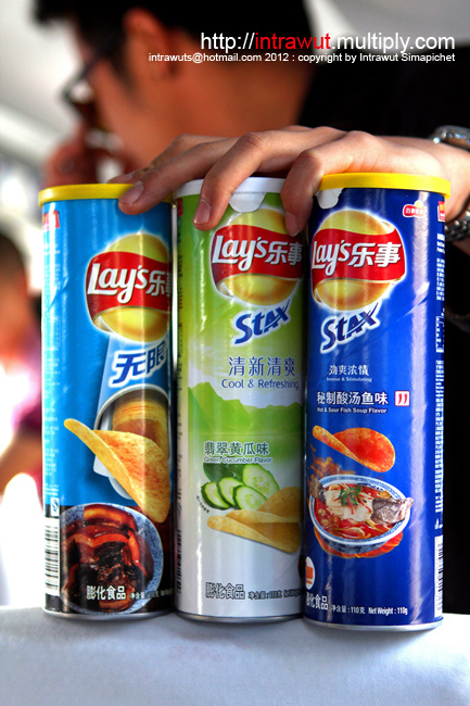 ขนมเลย์ที่นั่น มีรสชาติแปลกๆเพียบ ไม่ว่าจะเป็นรสแตงกวา รสหมูสามชั้น รสปลาสามรส เป็นต้น