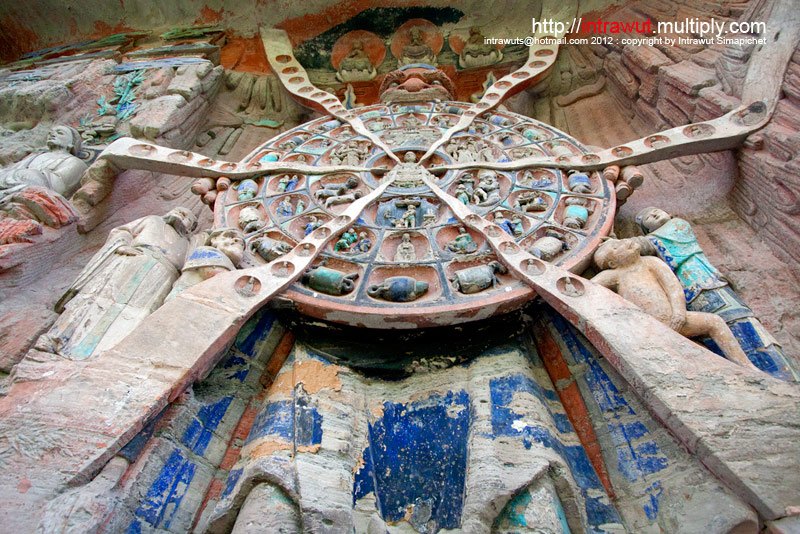 แต่ละผนังที่แกะสลักก็มีเรื่องราวที่กล่าวถึงพระพุทธศาสนาที่ผสมผสานกับลัทธิเต๋า สอนให้คนรู้จักความดีความชั่ว