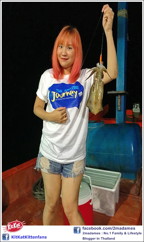ตกเองไม่ได้สักตัวค่ะ สงสัยจะไม่ใช่ทาง แต่พี่คนเรือตกปลาหมึกมาได้ ตัวใหญ่มากๆ หลังจากตกขึ้นมาแล้ว ปลาหมึกจะสลักหมึดดำออกมาให้ระวังหมึกเลอะ แต่พอหมดคะแล้วตัวก็จะใสๆแบบนี้