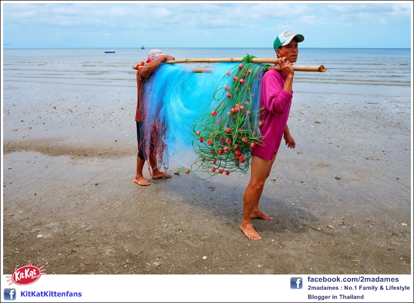 สักพักมีคนหาปลาที่เพิ่งเทียบฝั่งเดินผ่านหน้าหาดมาเลยขอถ่ายรูปนายแบบทั้ง 2 ไว้ค่ะ