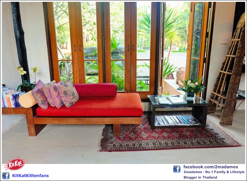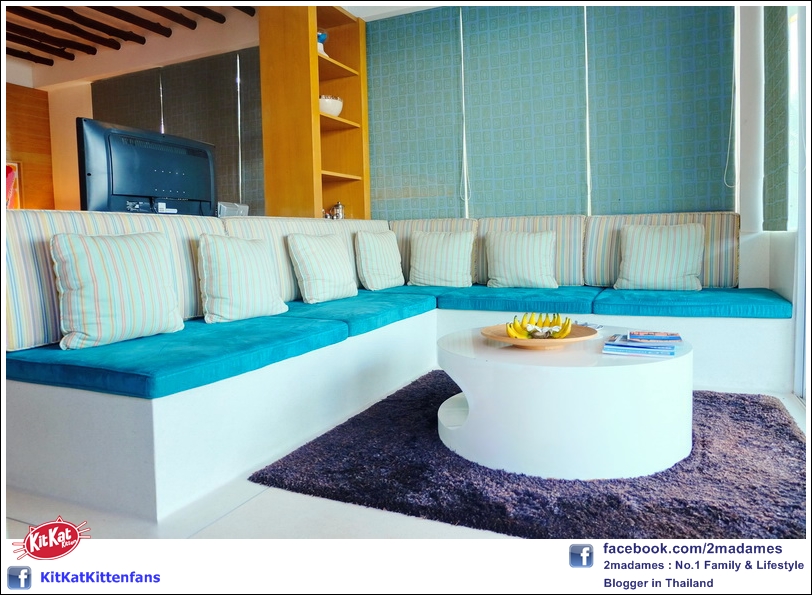 เข้ามาจะเจอกับโซฟาใหญ่สีฟ้าหันหน้าออกไปหาทะเล พร้อมกับกล้วยเล็บมือนาง ที่วางเสิร์ฟเอาไว้