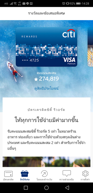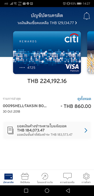 จะมีรูปบัตรเครดิตหรือบัตรต่างๆที่เรามี พร้อมแสดงยอดวงเงินคงเหลือ กับยอดที่เราใช้จ่ายไป พร้อมกับรายการล่าสุดด้วย