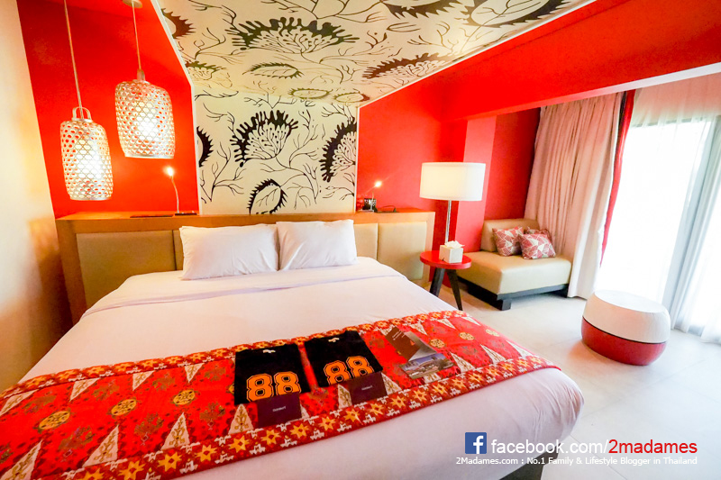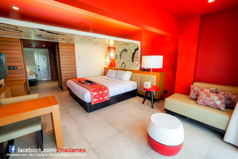 ห้องพักของเราเป็นแบบ Deluxe Terrace Park View ภายในห้องตกแต่งด้วยสีแดงสดใส