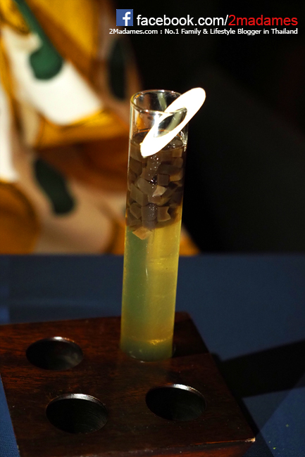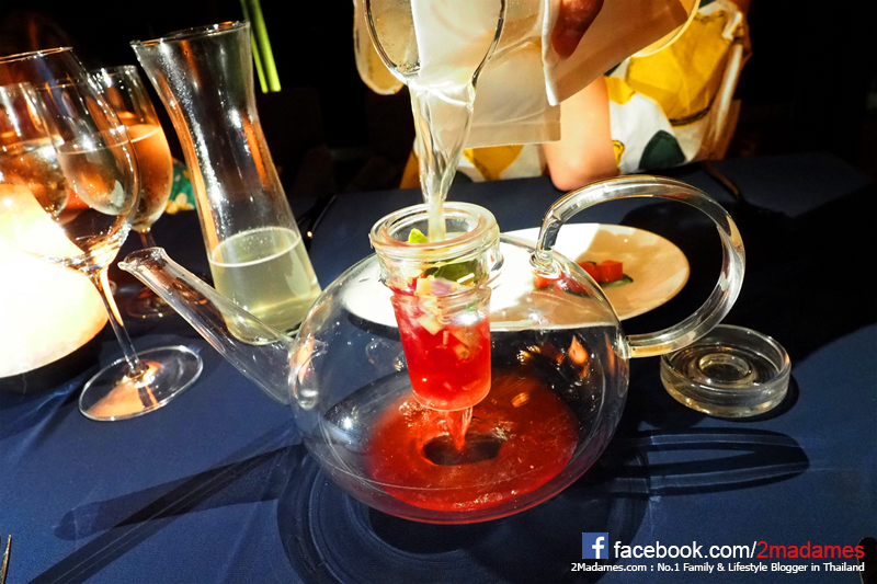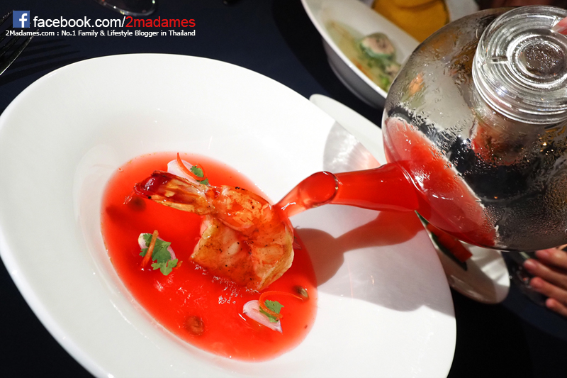 ซุปในเซ็ตนี้เป็นต้มยำกุ้ง ที่มีกิมมิคในการเสิร์ฟ โดยเชฟจะเตรียมเครื่องเทศต่างๆมาในรูปแบบเจลลี่ ใส่เอาไว้ในไส้กรองชา ตอนเสิร์ฟค่อยๆมาบรรจงเทซุปใส่กา จนเกิดเป็นรสชาติและสีสีนที่สวยงาม สีแดงๆนี่เป็นสีจากมะเขือเทศ