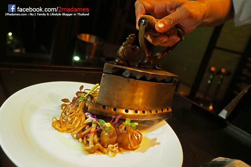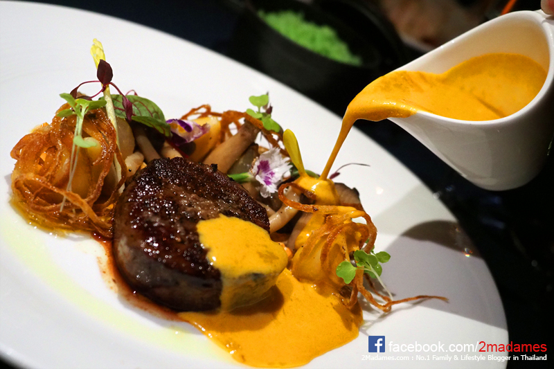 และก็มาถึง Main Course เป็นมัสมันเนื้อวากิว ที่ใส่เครื่องเทศชั้นดีทั้งหอมแดงและมันฝรั่งลูกเล็ก โรยหน้ามาด้วยหอมหัวใหญ่ทอดกรอบ ตอนเสริ์ฟมาแค่ก้อนเนื้อเพียวๆนะ มีการเอาเตารีดโบราณมานาบโชว์ ให้ได้ยินเสียงคล้ายเนื้อนาบกระทะ