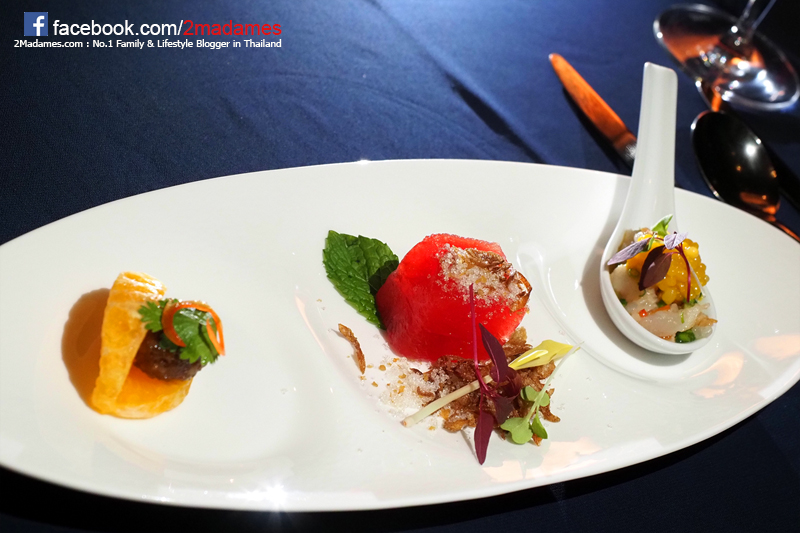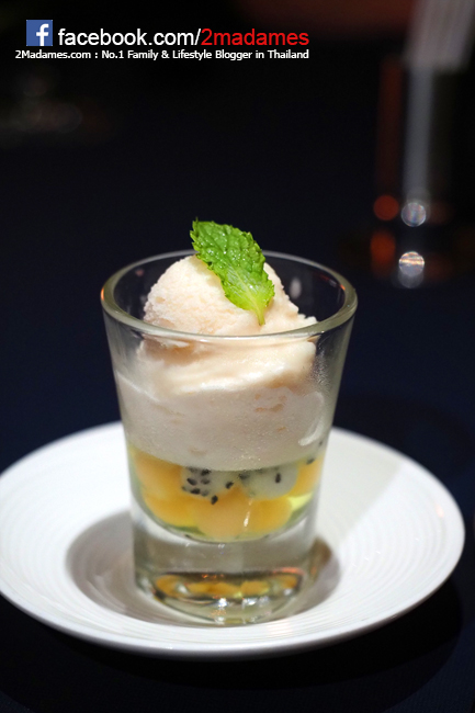 ก่อนจะถึงอาหารจานหลัก จะเสิร์ฟของหวานล้างปากสักนิด เซ็ตนี้เสิร์ฟเป็นเชอร์เบทกระเจี๊ยบ มีความเปรี้ยว หอมหวานเบาๆ
